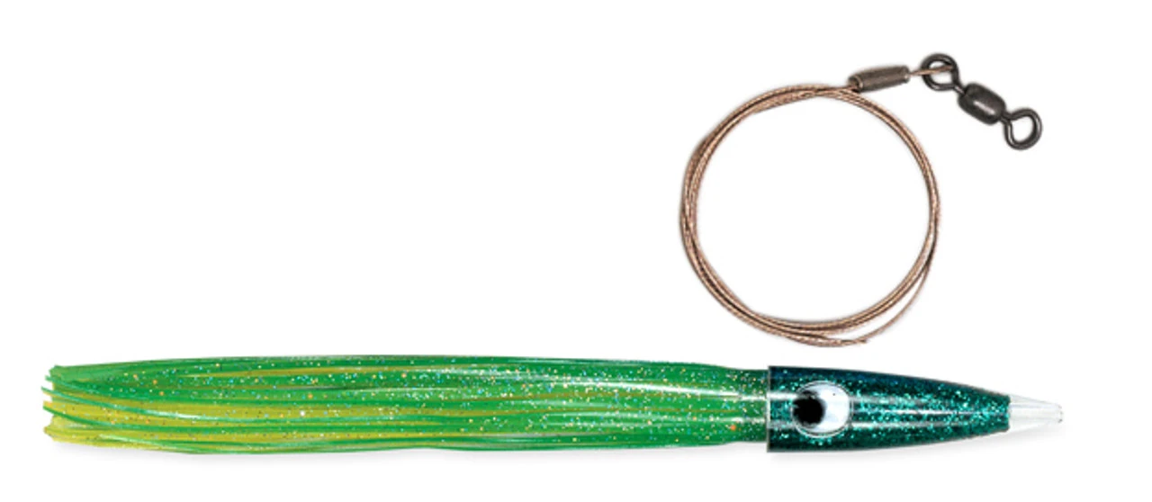 The C&H Wahoo Whacker, with its missile shaped, weighted head, leaves a minimum bubble trail. This shape allows it to run deeper in the water and can be trolled at any speed. Works great on the downrigger.