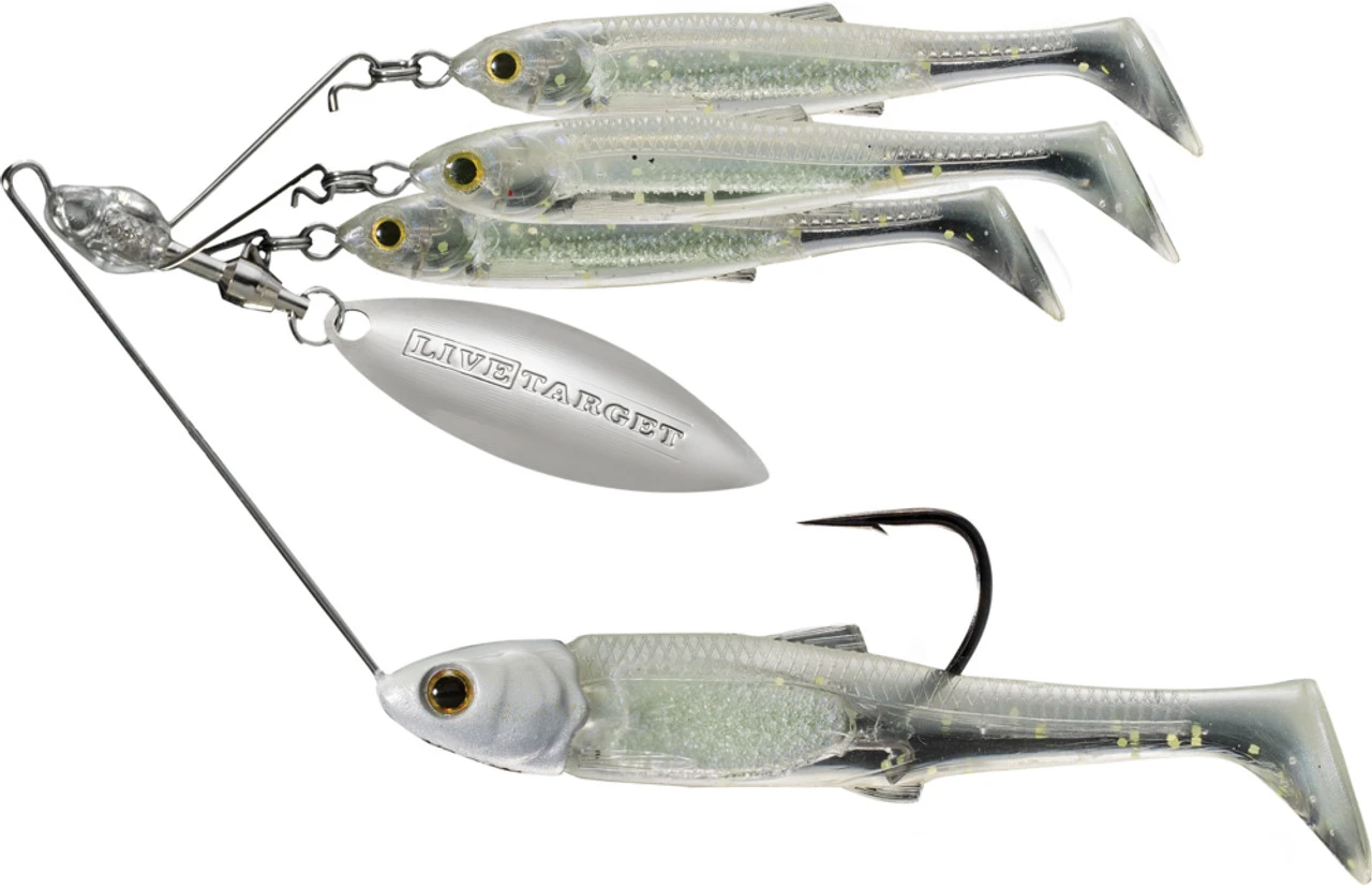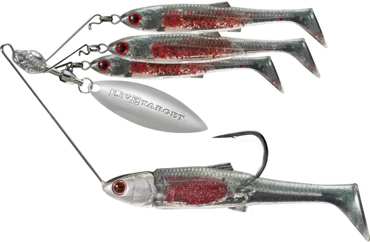 The LIVETARGET BaitBall Spinner Rig is certainly one of the most eye catching baits you’ll ever see. Designed to mimic a fleeing group of small baitfish, the BaitBall Spinner Rig is essentially the ingenious combination of a spinnerbait and an Alabama rig. At its core, the BaitBall Spinner Rig is built around a wire frame similar to those seen on traditional spinnerbaits. At the top of the frame are three soft plastic paddle-tail teaser baits, and at the business end is a larger “target bait” rigged on a razor sharp wide gap hook. All 4 realistically patterned swimbaits are strategically placed in a way that causes only the target bait to be eaten. Thrown into the mix is a single willow leaf blade for additional vibration and flash to attract hungry predators. The end result is a versatile lure that can be fished in an extremely wide variety of environments and situations. It’s perfect for those times of year when the baitfish are schooled together or for throwing into places that a full size A-rig can’t get into. All of the teaser and target baits are interchangeable with LIVETARGET’s BaitBall Spinner Rig Interchange Packs.
