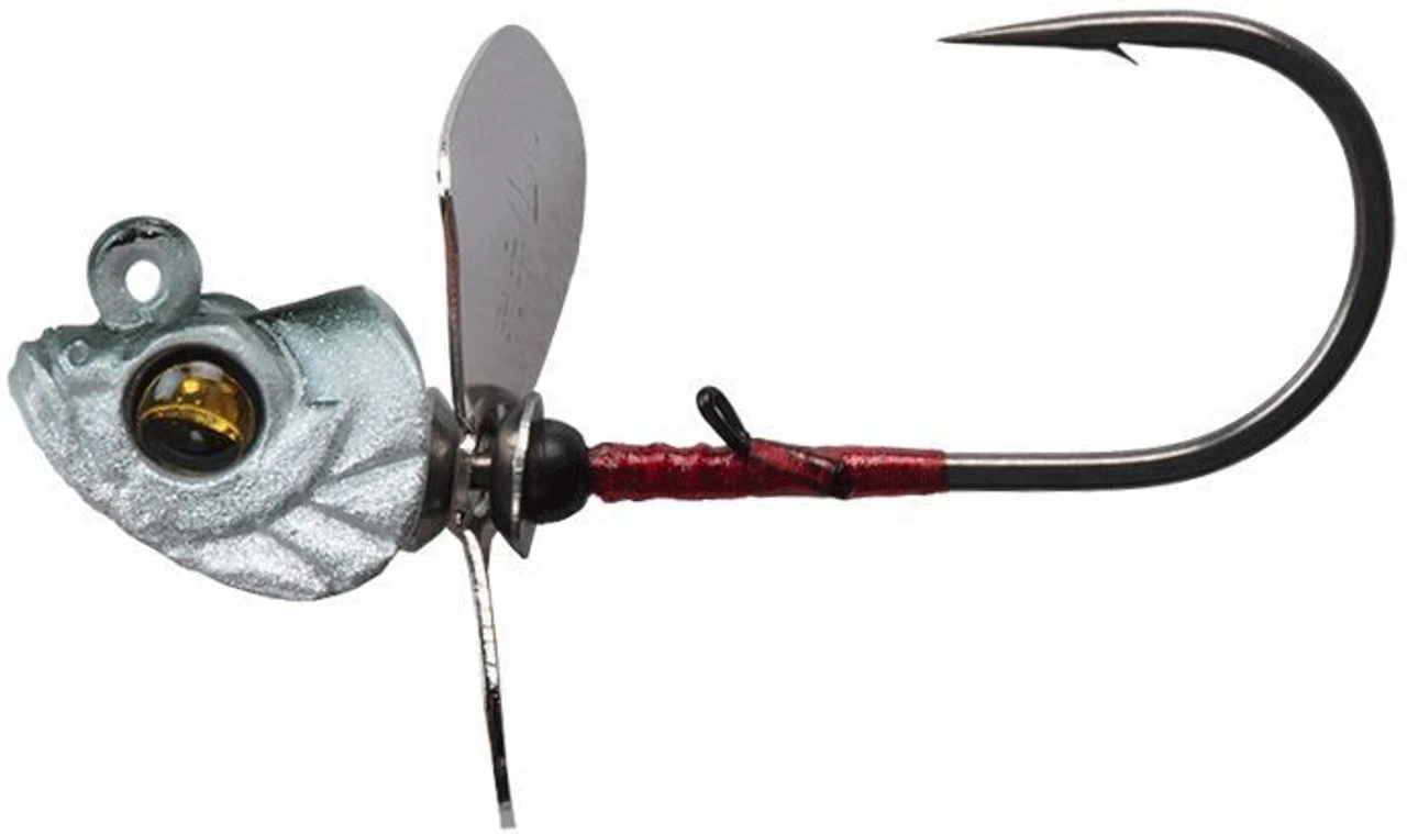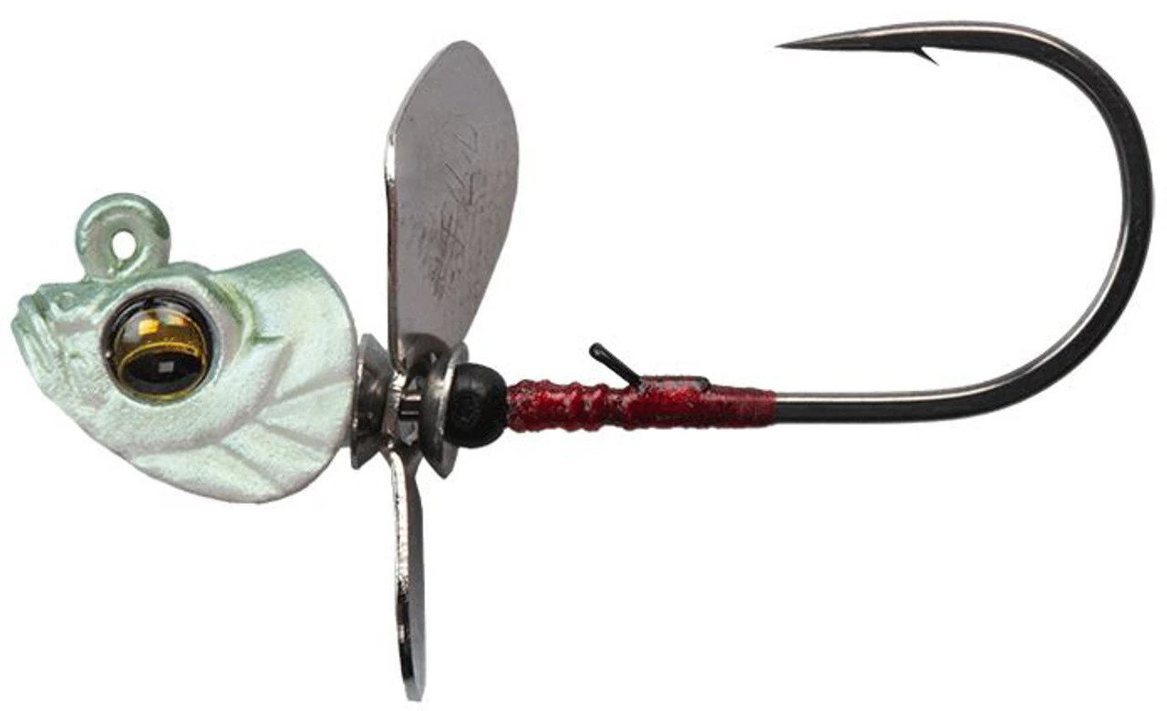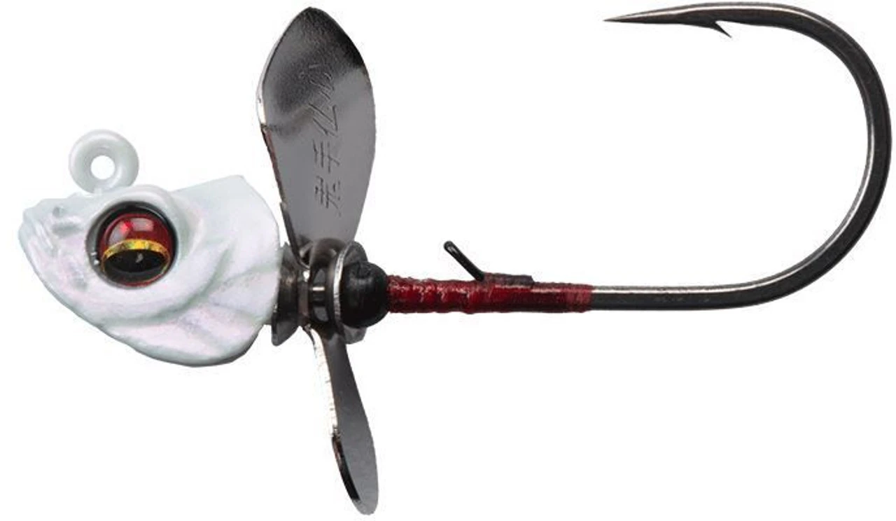 The Megabass Okashira Screwhead takes the exquisite design of the Okashira Jig Head and adds an asymmetrical propeller to the mix for an attractive flash and subtle vibration. With finely tuned bend angles, one blade of the propeller is larger than the other, which generates a unique pulsating vibration that bass can sense from a distance. The Okashira Screwhead supercharges your favorite soft plastic swimbait by not only adding a tantalizing display of flash and vibration, but also perfects the action of swimbaits with its hydrodynamic design that channels water under the chin and around the body. The head design improves range-keeping and increases horizontal stability. The Okashira Screwheads are built around a rigid BKK Super Slide hook that provides superior penetration, and are fitted with a hand tied bait keeper that offers a secure hold without tearing your soft plastics.