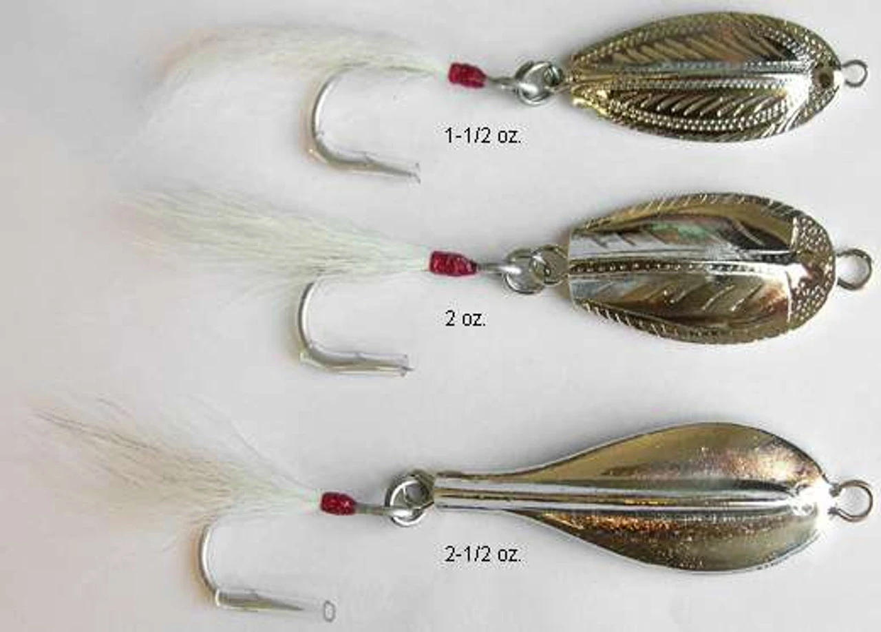 Point Jude Butterfish 1 1/2 , 2 oz. : A deadly choice when small menhaden (peanut bunker) or any other oval baitfish are the prey. Intricate design, bullet-like castability, and irresistable side to side action distinguish these lures from all others.