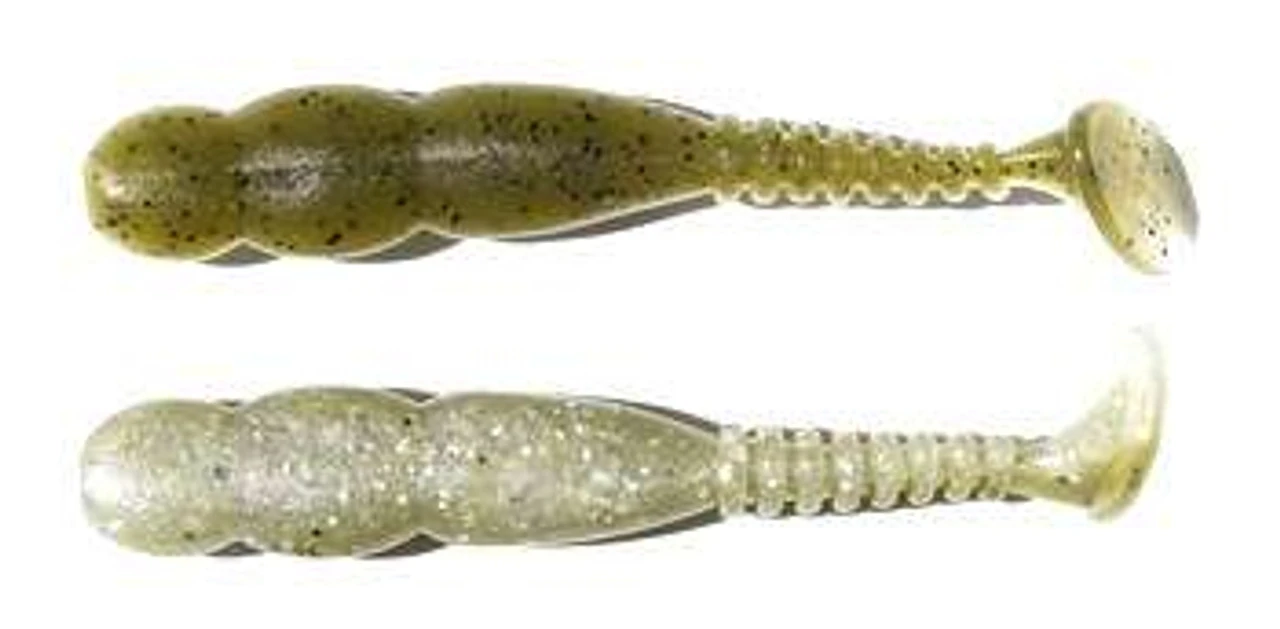 Reins Rockvibe Shad Lures are made with a thick body and ringed tail section that ends in a paddle. This design allows for big action as this bait gets pulled thru the water. This lure is salt infused and shrimp scented.