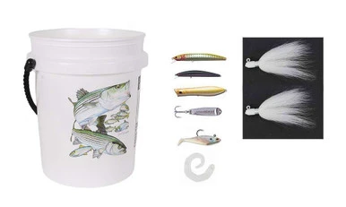 Looking to target Striped Bass strictly casting artificial lures, and not sure what you need to get started? TackleDirect has put together all of the best striper casting lures to help take out all the guess work. This kit includes Daiwa SP Minnows, a Tsunami Taking Popper, a Hopkins Shorty, Magictail Bucktails, a Storm Swim Shad, and a pack of Otter Tails to cover all of the bases whether you are on the boat, the surf, or the sod banks. A TackleDirect 5 gallon bucket with a David Dunleavy striper design is also included to help organize all of your new gear and for use on the boat. Next time you hear about blitzing bass on top, remember to grab your Striper Casting Bucket and get in on the action.