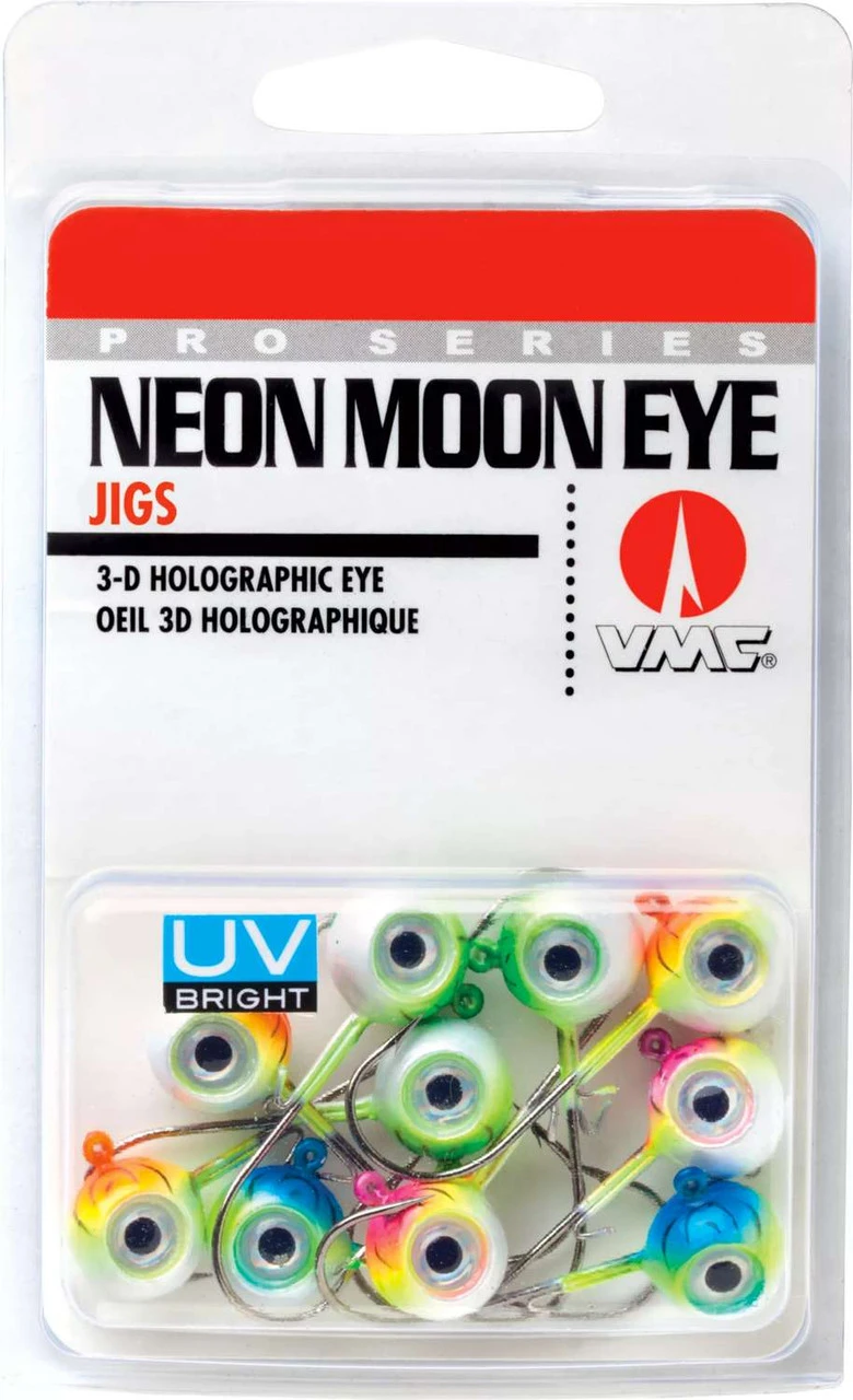 The VMC Neon Moon Eye Jig Kit feature 3-D holographic eyes that create the illusion of a wider profile while adding realism. The Neon Moon Eye Jig is an upgraded version of the traditional aspirin shaped heads to provide added control. These are assembled using a VMC Premium high carbon steel hook with top of the line black nickel finish. The wide range of colors guarantee you to catch more fish in all water conditions.